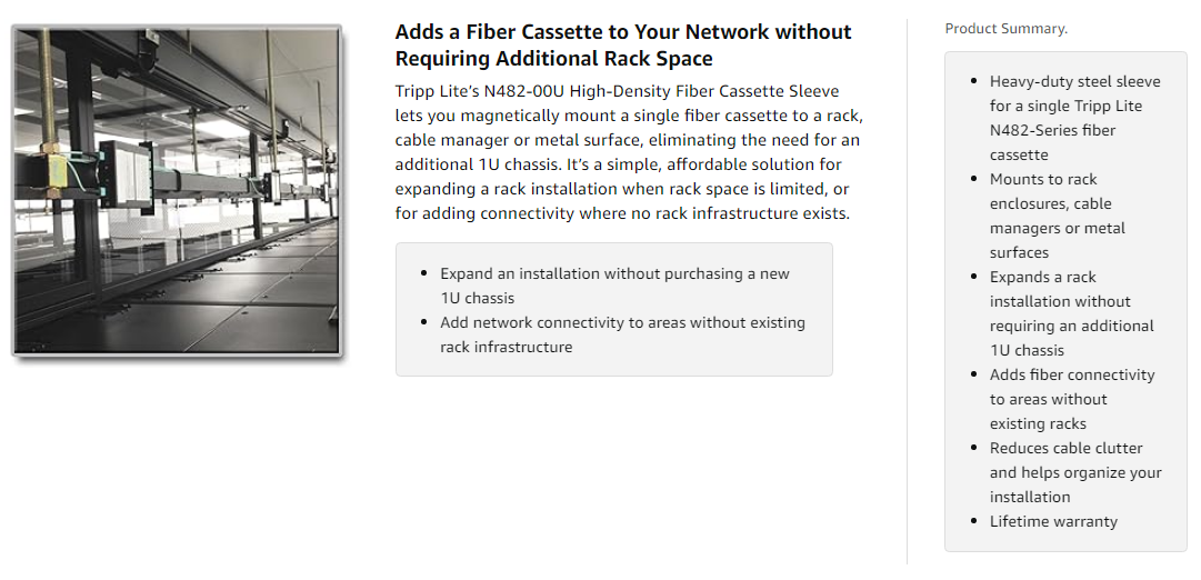 Two large magnets on the back of the sleeve mount effortlessly to a metal surface, bringing fiber connectivity to areas where a traditional panel won’t fit. The N482-00U is also a great option for adding network connectivity to areas without an existing rack, such as remote workstations, new build-outs or temporary installations.