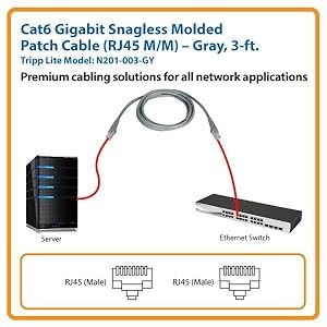 This three-foot Tripp Lite Cat6 Gigabit Snagless Molded Patch Cable is the ideal solution for connecting high-speed network components like computers, printers, Internet-enabled gaming systems and Blu-ray players, copy machines, routers and modems in a home or office application.