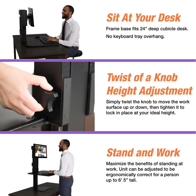 Sleek wood construction and a durable laminate coating provide years of use with a modern style. The rear portion of the desk is tapered to fit corner cubicles. Heavy steel base prevents tipping. 28”W X 23”L X 0 to 15.5”H. Requires monitor with a VESA mount. Patent No. 9,332,839