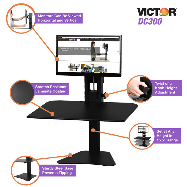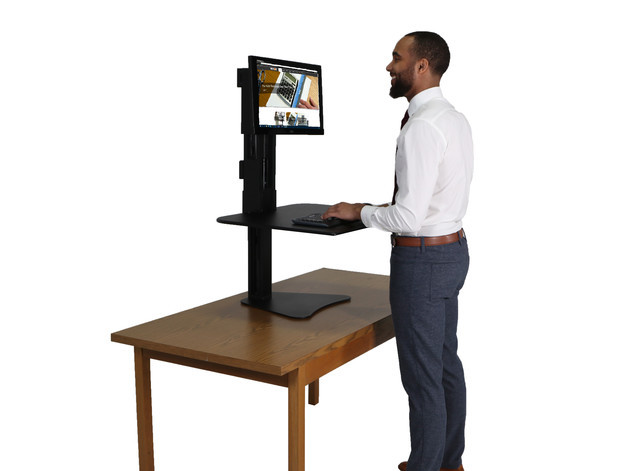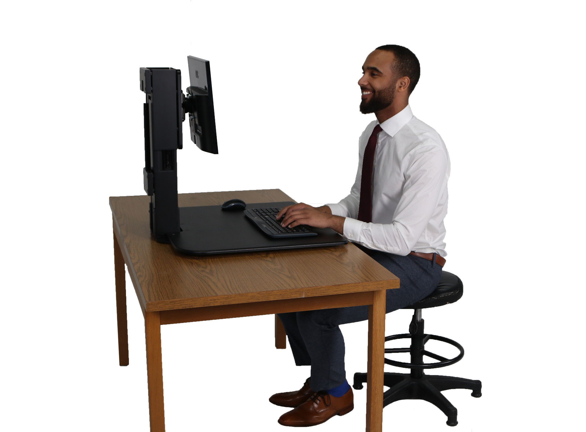 This in turn reduces or eliminates the pain users experience from being hunched over their desks and the negative long-term effects of sitting for long hours. The DC300 transforms any sit down desk into a sit OR stand-up desk. The 28” wide by 23” deep surface is raised up to 15.5” for ergonomic placement of laptop computer, keyboard, mouse, or papers while standing.