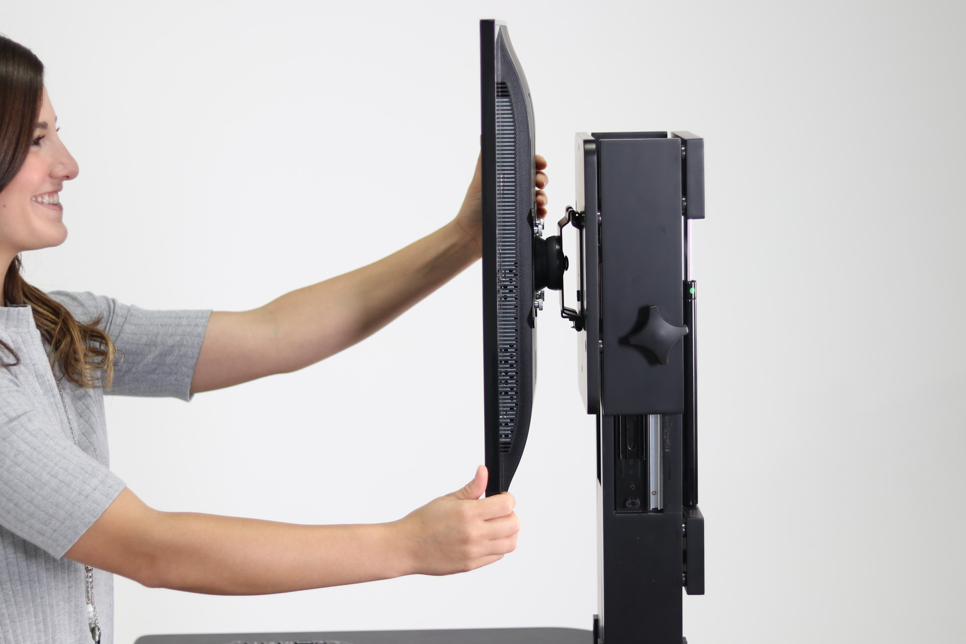 Gas strut design allows easy custom height adjustment of both desk and monitor with the loosening of a knob. The monitor holder is also height-adjustable. Need a break from standing? Simply push the surface down to desktop level.