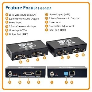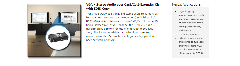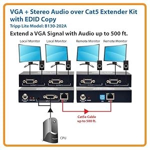 The B130-202A can extend a 1024 x 768 (60Hz) resolution video signal with stereo audio up to 500 feet and a 1440 x 900 (60Hz) video resolution signal with stereo audio up to 165 feet from the video source. Send video and audio signals to two local monitors in addition to two remote monitors. The B130-202A is HDCP compliant.