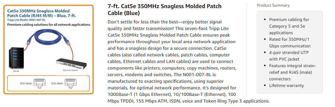 This seven-foot Tripp Lite Cat5e 350MHz Snagless Molded Patch Cable is the ideal solution for connecting network components like computers, printers, internet-enabled gaming systems and Blu-ray players, copy machines, routers and modems in a home or office application.