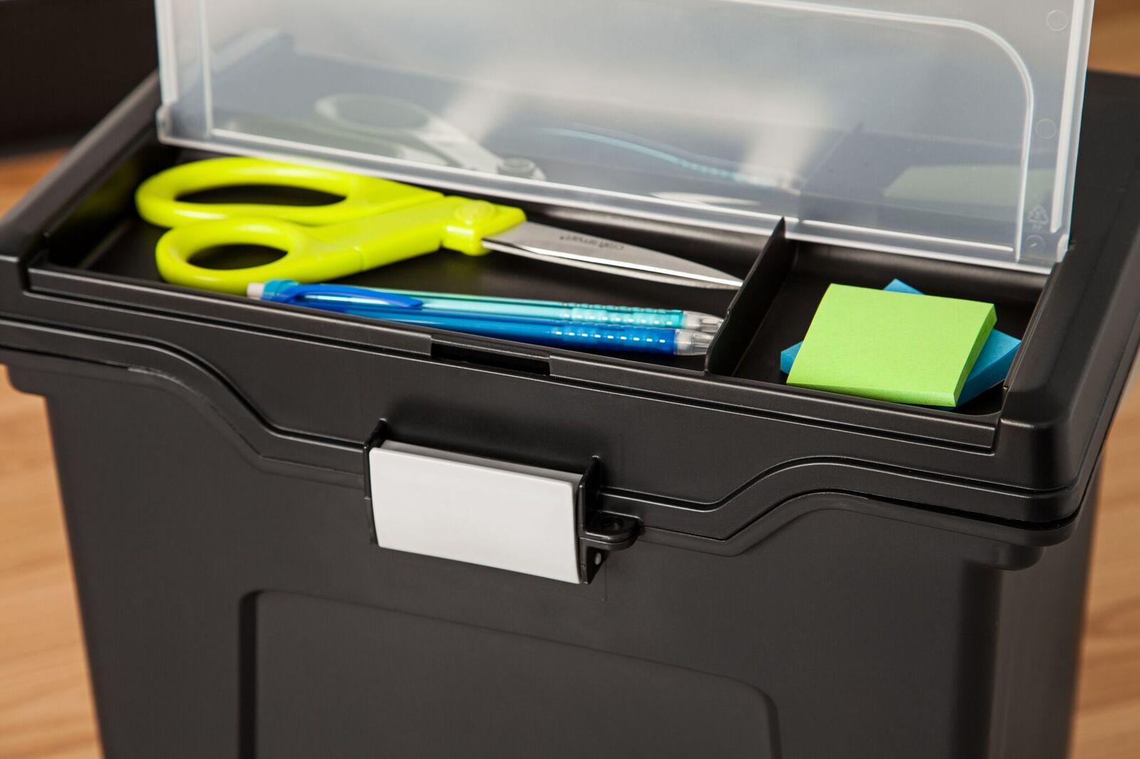 This portable letter size file box by IRIS USA, Inc. features on-the-go organization of documents and small office supplies.