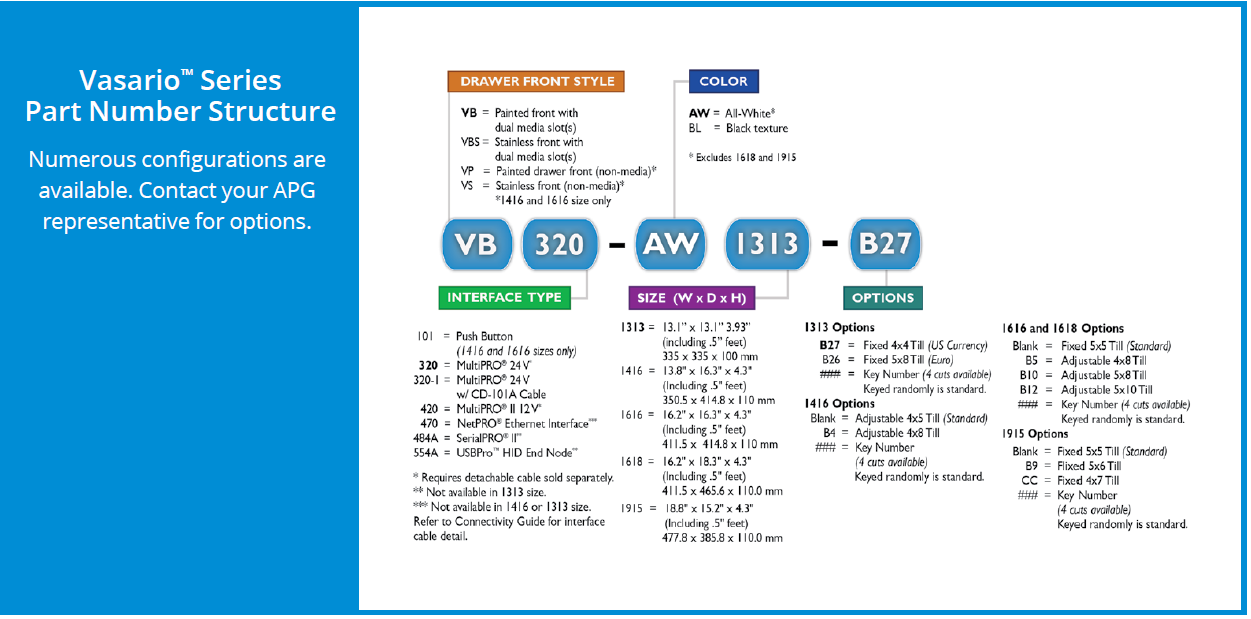 A Cost Effective Solution for Low Volume Environments. The perfect solution for applications that can be addressed with a standard duty cash drawer. The Vasario™ Series is the cost effective choice that doesn’t sacrifice quality or dependability.Each member of the Vasario™ cash drawer family is competitively priced and includes features, such as multifunction locks and drawer status reporting, found in more expensive cash drawers. A variety of models with a wide range of size, style, color, interface and till configuration options are available to meet your specific requirements.