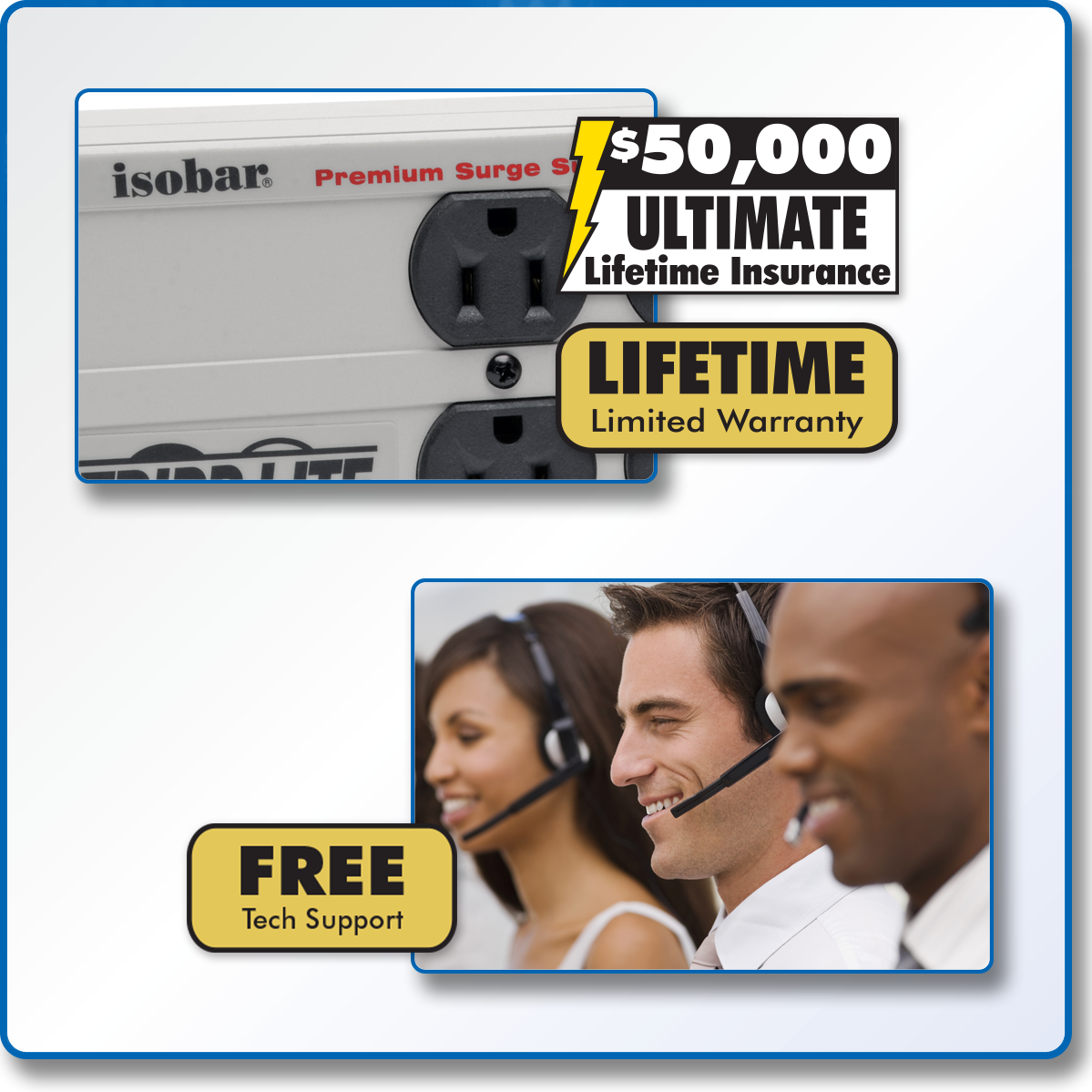 If your connected equipment is damaged by a surge—even a direct lightning strike—Tripp Lite will repair or replace it up to the value of the Ultimate Lifetime Insurance. If the surge protector stops working, simply return it to Tripp Lite for a free replacement. And if you ever have a question, our Chicago-based tech support team is standing by ready to assist you free of charge.