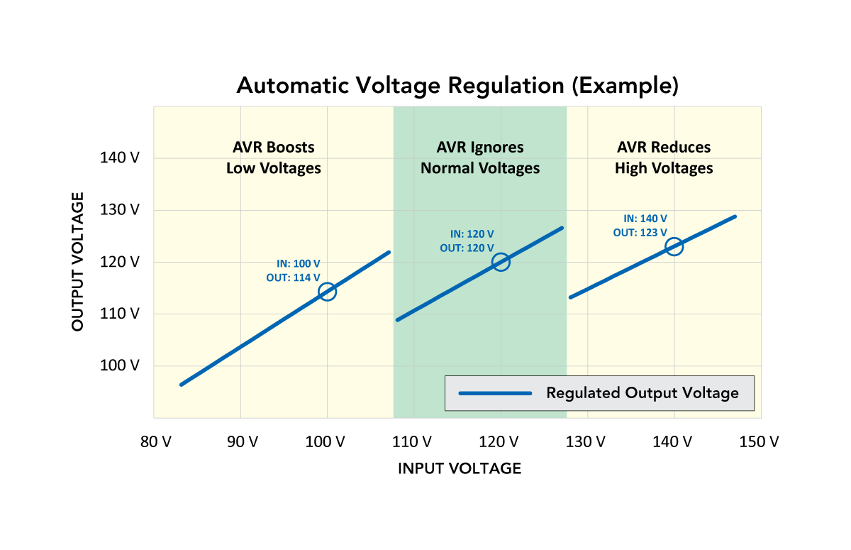 In locations with chronic voltage problems, frequent switching to battery drains reserve power and shortens battery life. This UPS system has a feature called automatic voltage regulation (AVR) that solves the problem. The UPS detects when input voltage is out of bounds and corrects it without using the battery.