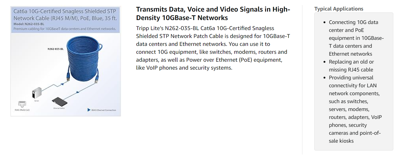 When you choose this genuine Tripp Lite cable, you get superior performance plus peace of mind. We’re so confident of its quality that we warrant it to be free from defects in material and workmanship for life! The N262-035-BL is also manufactured in compliance with strict RoHS specifications, reflecting Tripp Lite’s commitment to environmental responsibility.