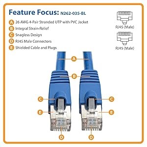 Made from 26 AWG 4-pair shielded copper, the N262-035-BL protects against line noise and EMI/RFI interference. Shielded RJ45 connectors minimize Near-End Crosstalk (NEXT) levels, and molded, snagless boots prevent the locking connectors from breaking off during installation. A rugged PVC jacket provides protection, and integral strain relief allows the cable and connectors to move freely without cracking.