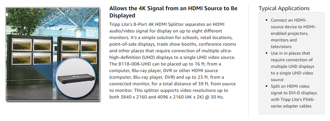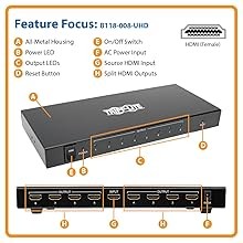 When using the most current protocols, your installation is guaranteed vibrant, rich picture and sound. The B118-008-UHD supports full 3D digital video, 36-bit Deep Color (12 bits per channel) and xvYCC/x.v.Color. It’s compatible with the latest HDCP and EDID content standards. It also supports DTS-HD, Dolby TrueHD, Dolby Digital Plus and LPCM 7.1 channel surround sound for immersive, hi-fi audio. This splitter has a video amplifier bandwidth of 340 MHz/3.4 Gbps per channel (10.2 Gbps total) and supports lip sync pass-through.