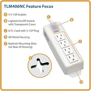 Have convenient, cost-effective, reliable electrical service where you need it with Tripp Lite’s TLM406NC Power It! Power Strip. With keyhole mounting installation, a rugged housing, plenty of outlets and 15-amp service, Tripp Lite’s TLM406NC is ideal for distributing power to appliances, power tools and lighting equipment. It provides reliable, consistent power service for multiple devices. Its rugged metal case stands up to the most demanding environments, and keyhole mounting slots on the back of the unit allow the TLM406NC to be installed wherever reliable, multi-outlet power distribution is required.