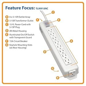 You’ll never have to worry about lack of available outlets with the TLM915NC. With a length of less than 14 inches, the TLM915NC fits a row of eight outlets on the top of the unit, plus an extra outlet located on the end of the unit to accommodate a bulky transformer.