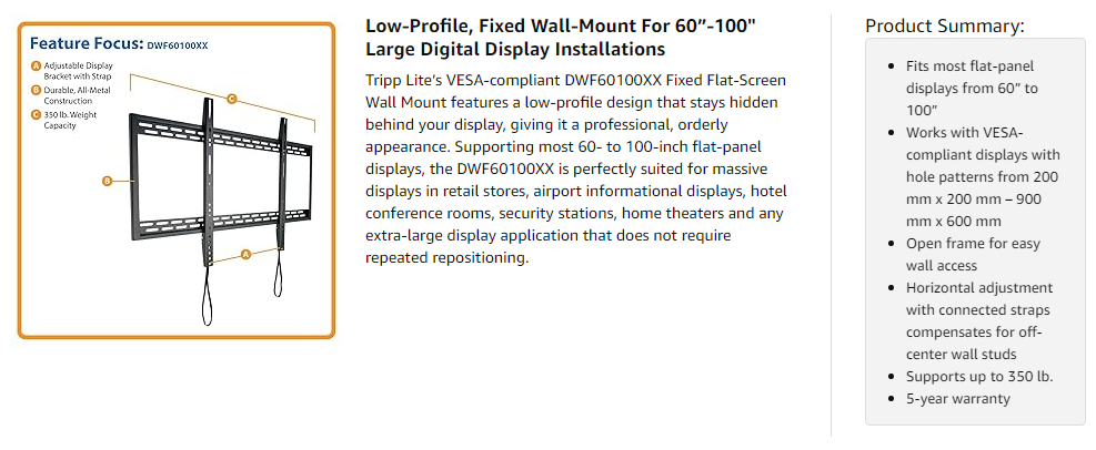 The DWF60100XX’s durable, all-metal frame supports displays weighing up to 350-pounds. Its scratch-resistant powder-coat finish tolerates frequent handling.
