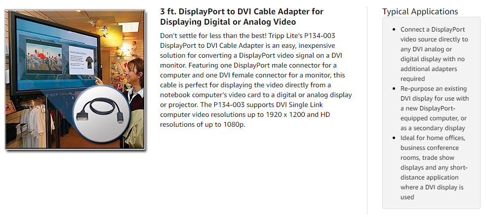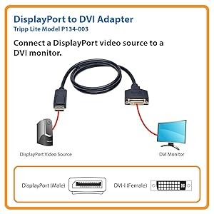 The P134-003 is compatible with any PC or Mac equipped with a female DisplayPort. The P134-003 is a passive Cable Adapter designed for short-distance applications and requires the host computer’s port to be DP++. Check your computer’s documentation for compatibility.