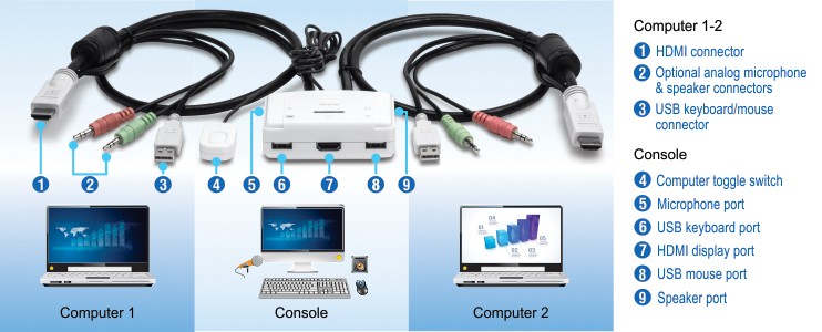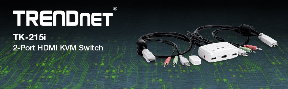 TRENDnet's 2-Port HDMI KVM Switch, model TK-215i, controls two computers (with an available HDMI port) with one set of console controls. No driver installation required, simply plug in the integrated cables to share two computers with a full HD 1080p display. The TK-215i supports HDMI and 3.5 mm analog audio and features an ergonomic computer toggle switch.