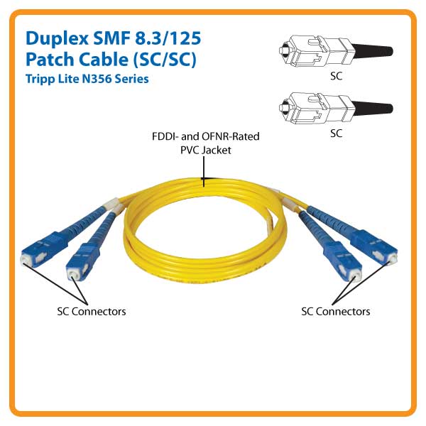 The N356-30M comes with widely compatible dual SC connectors that are thoroughly tested to ensure they meet Tripp Lite's stringent insertion loss standards. The connectors' edges are also beveled and color coded for easy and secure connection throughout your network.