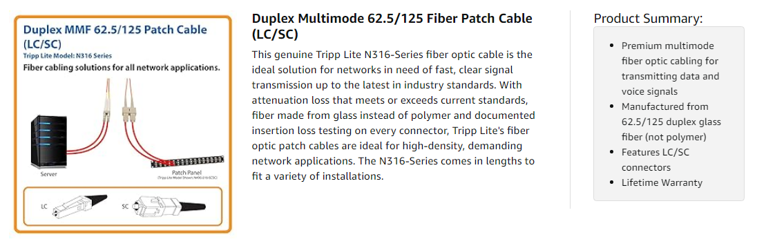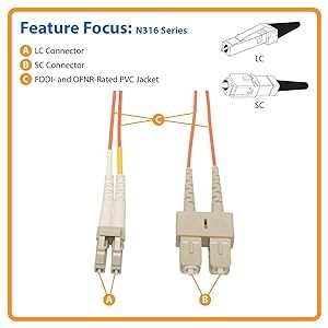 The N316-Series is manufactured using top quality materials. With 62.5/125 duplex fiber, a FDDI and OFNR-rated PVC jacket, sturdy connectors and fiber made from glass instead of a polymer, Tripp Lite's fiber optic cables are made to last in high-demand data center and networking applications.