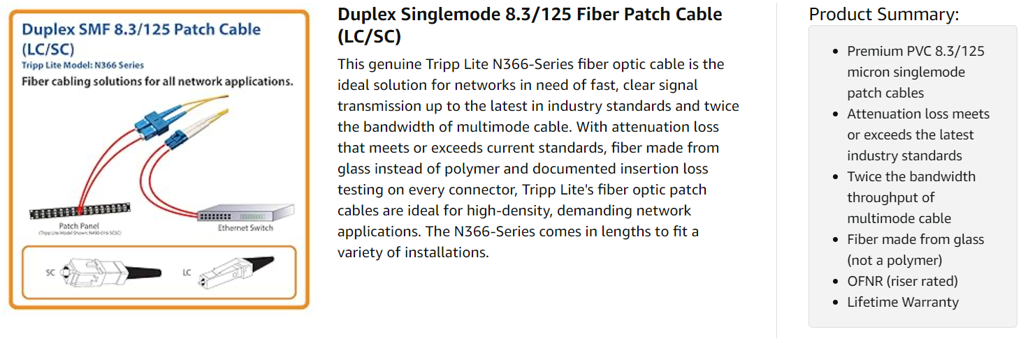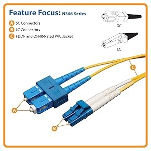 The N366-Series is manufactured using top quality materials. With 8.3/125 duplex fiber, a FDDI and OFNR-rated PVC jacket, sturdy connectors and fiber made from glass instead of a polymer, Tripp Lite's fiber optic cables are made to last in high-demand data center and networking applications.