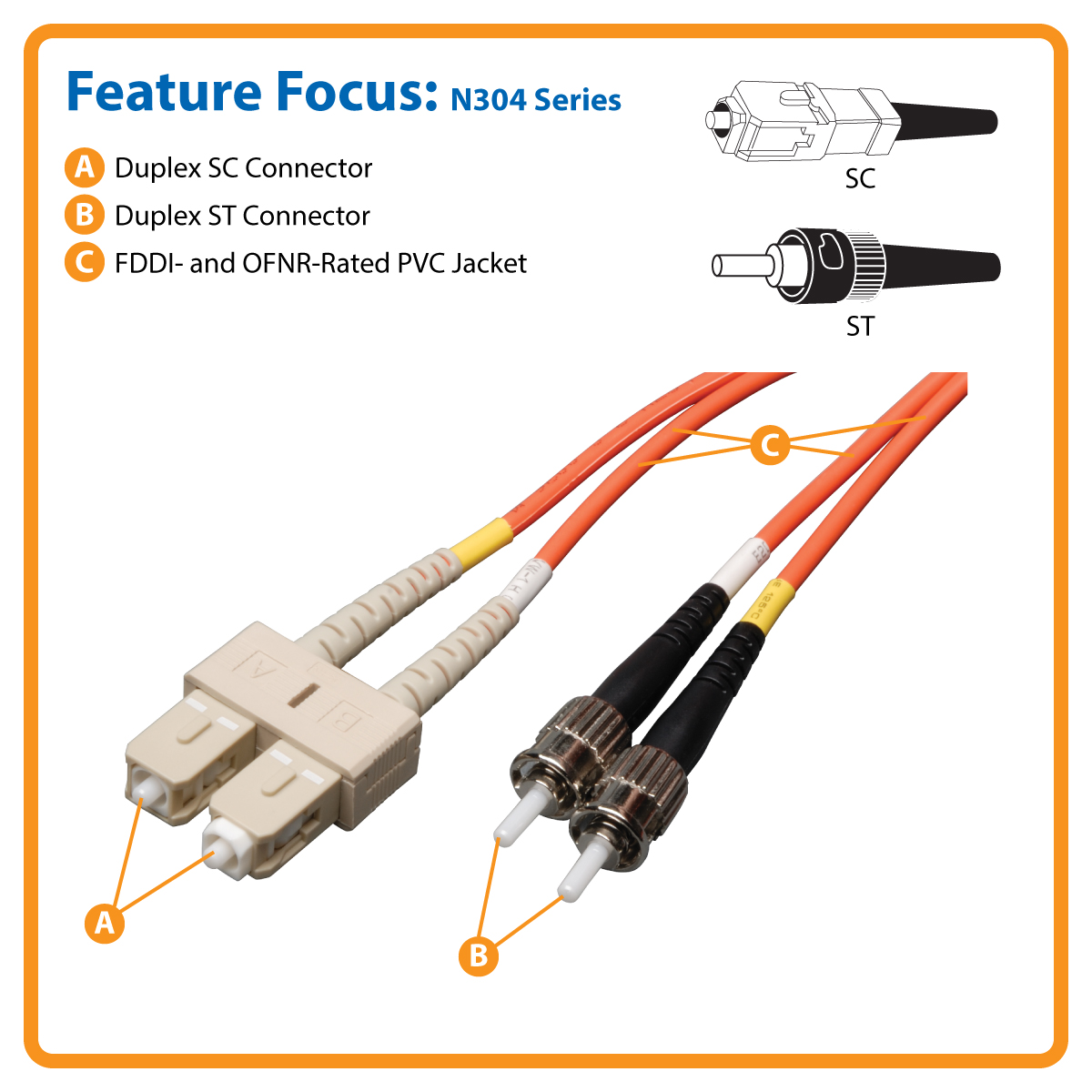 The N304-15M has dual SC/ST connectors that are widely compatible and thoroughly tested to meet stringent insertion loss standards. The connectors are color coded and have beveled edges for a secure connection.
