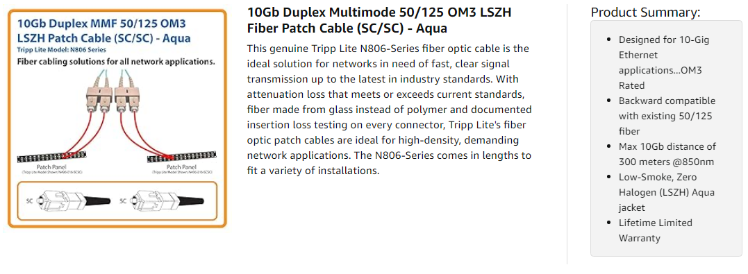 The N806-Series is manufactured using top quality materials. With 10Gb 50/125 duplex fiber, a Low-Smoke, Zero Halogen (LSZH) jacket, sturdy connectors and fiber made from glass instead of a polymer, Tripp Lite's fiber optic cables are made to last in high-demand data center and networking applications. The N806-Series is compliant with RoHS (Reduction of Hazardous Substances) standards, reflecting Tripp Lite's commitment to environmental responsibility.