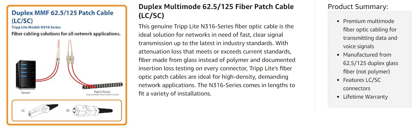 The N316-Series is manufactured using top quality materials. With 62.5/125 duplex fiber, a FDDI and OFNR-rated PVC jacket, sturdy connectors and fiber made from glass instead of a polymer, Tripp Lite's fiber optic cables are made to last in high-demand data center and networking applications.