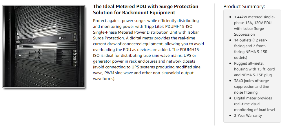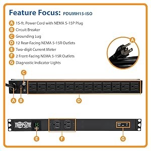The PDUMH15-ISO provides reliable 120V power via 14 outlets (12 rear-facing and two front-facing NEMA 5-15R outlets). It has a rugged all-metal housing and a 15 feet power cord with NEMA 5-15P plug. This PDU also has a 15-amp circuit breaker, a TVSS rear grounding lug and a switchless design to prevent accidental shutoff. Load capacity is 1.44kW.