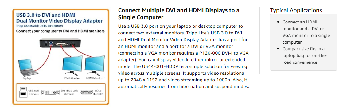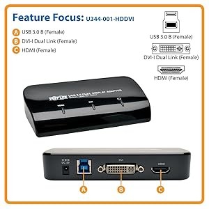 You can connect up to three adapters to a single computer, allowing for connection of up to six displays. The U344-001-HDDVI is compatible with Windows XP (32-bit), Vista (32- and 64-bit), 7 (32- and 64-bit) and 8 (32- and 64-bit). It is USB 3.0 compliant (5 Gbps) and backward compatible with USB 2.0 (but at USB 2.0 speeds).
