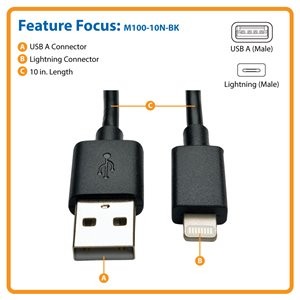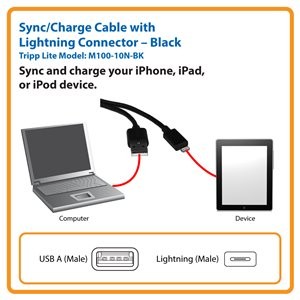 Tripp Lite’s M100-10N-BK USB Sync/Charge Cable with Lightning Connector allows you to transfer data to and from your latest generation Apple® iPod, iPhone or iPad device while charging the device at the same time. The cable features a uniquely designed reversible male Lightning connector that plugs into your device in either direction, making connections easier and faster. And, at only 10 inches, this cable reduces cable clutter and is easy to carry with you.