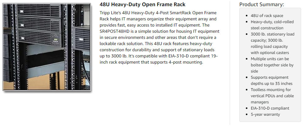 For peace of mind, the SR4POST48HD comes with a 5-year warranty. It’s manufactured in compliance with strict RoHS specifications, reflecting Tripp Lite’s commitment to environmental responsibility.