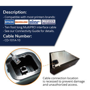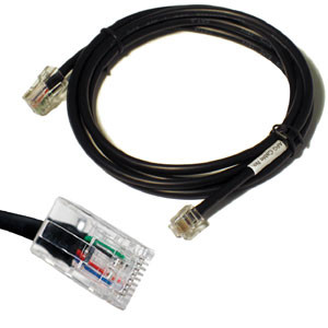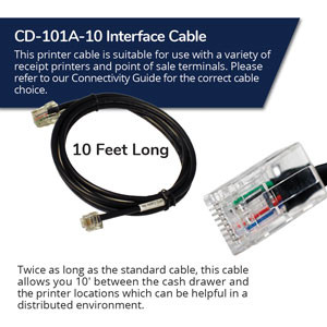The Interface cable measures 10 ft. long and has an 8-pin RJ45 male plug at one end for connecting to the cash drawer and a 6-pin RJ12 female plug for connecting to the receipt printer or terminal.