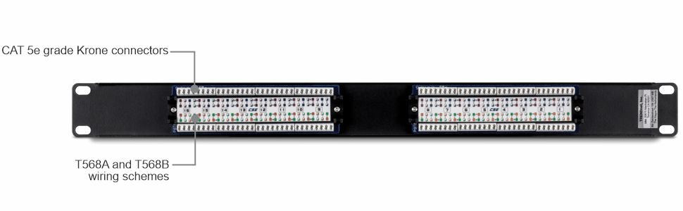 CAT 5e grade Krone connectors with color-coded labeling for T568A and 568B wiring schemes. 1000Base-T Gigabit Copper Ethernet ready.Backward compatible with CAT 3, 4 and 5 cabling. Complies with EIA / TIA 568A and ISO / IEC 11801.