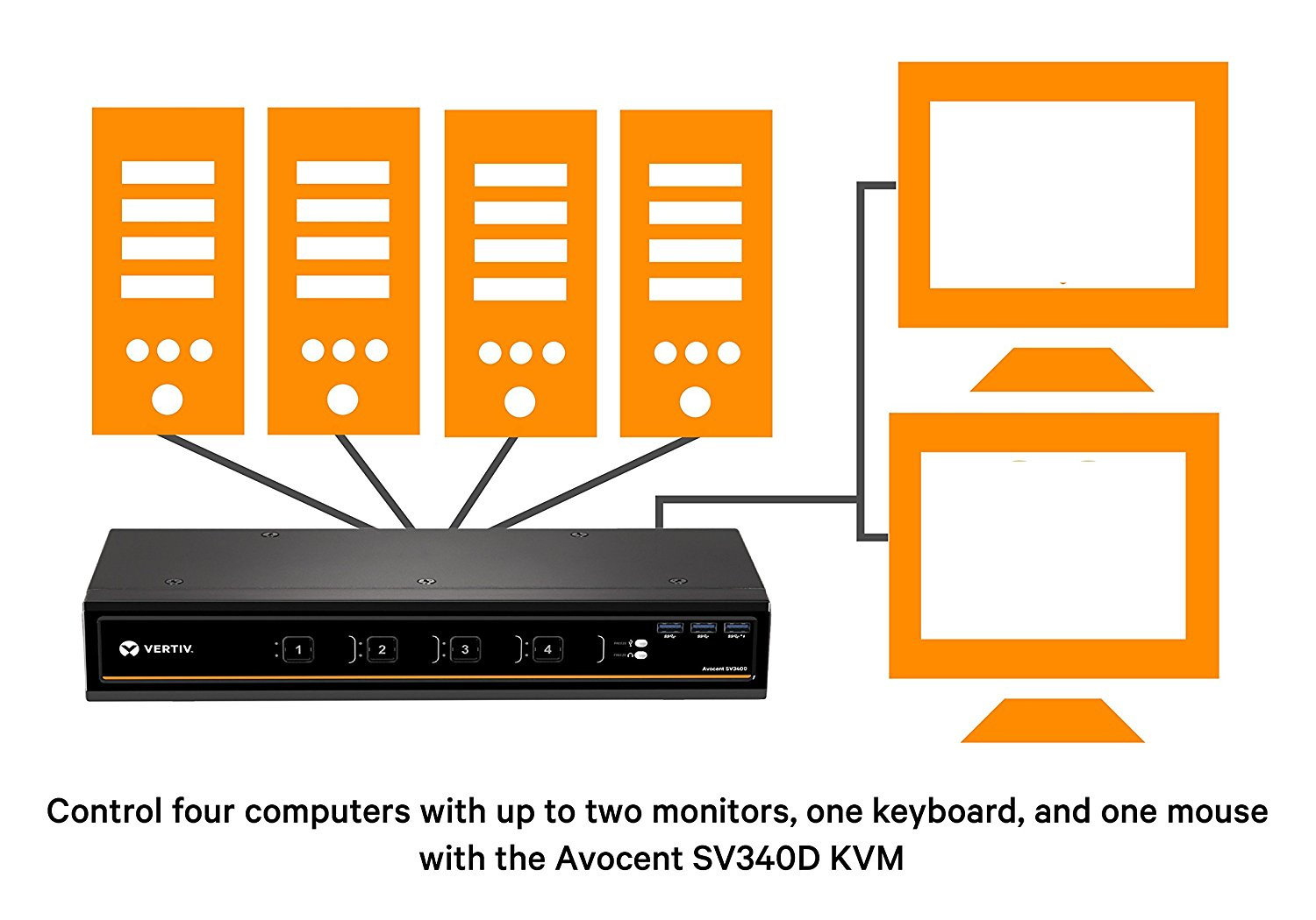Vertiv Avocent SV 300 KVM Switches have a small desktop footprint but deliver instant access to multiple computers. When access is required to desktop computers, printers, mobile devices, corporate ERP and CRM systems, mail servers or ultra HD multimedia switches, Avocent SV 300 KVM Switches pack advanced features for fast control.