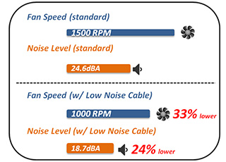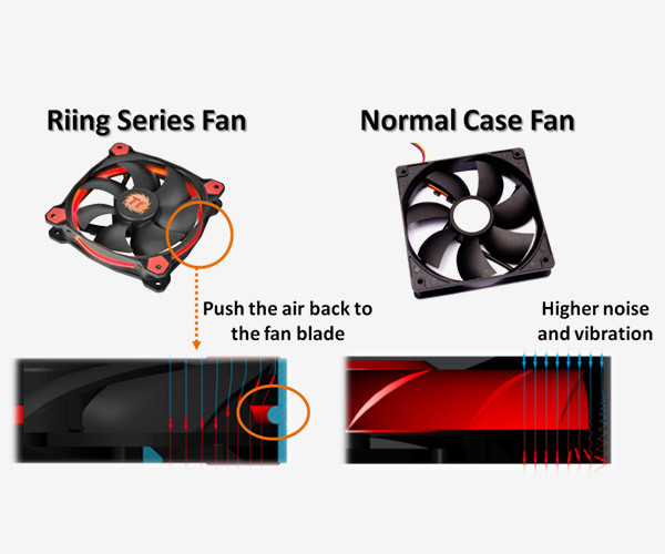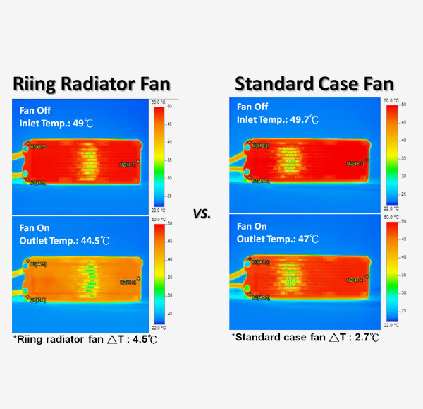 Compared to the standard case fan, the combination of three Riing 12 radiator fans and RL360 radiator delivers 40% better cooling performance. (Inlet and outlet temp. are 49℃ and 44.5℃ in respective, △T= 4.5℃)