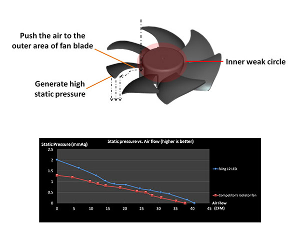 Custom designed for high-static pressure requirements of demanding applications such as radiators, the Concentrated Compression Blade (CCB) is engineered to focus the inner weaker circle of air outwards, allowing the outer section to pressurize and compress the air.