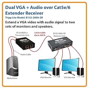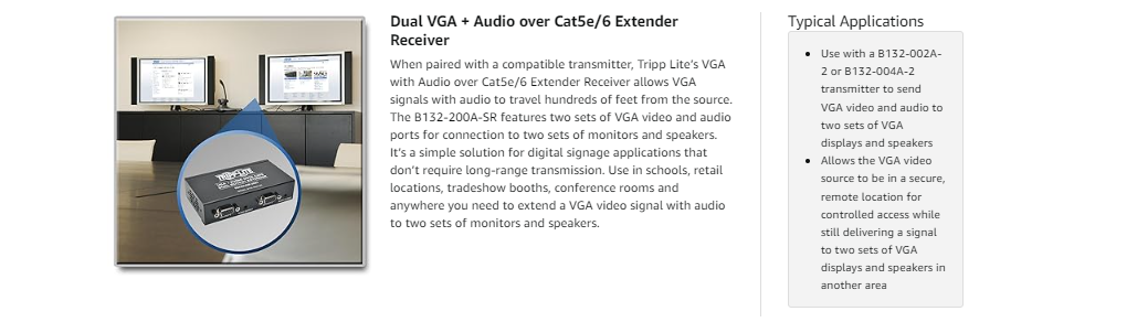 The B132-200A-SR is for use with Tripp Lite’s B132-002A-2 or B132-004A-2 VGA with Audio over Cat5 Extender/Splitter Transmitters. The B132-200A-SR extends a 1440 x 900 video signal with audio up to 150 ft. or a 1024 x 768 video signal with audio up to 300 ft. The signals travel from the transmitter to the receiver over user-supplied Cat5e/6 cable. To achieve maximum distance and resolution, use 24 AWG solid-wire Cat5e/6 cable, such as Tripp Lite’s N202-Series Cat6 Cable. With the B132-200A-SR, you have the flexibility to house the video source in a secure, remote location while still delivering the signal to VGA displays or projectors in another area.
