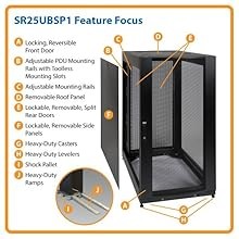 Secure access and efficient airflowThe SR25UBSP1 is designed to provide a safe, secure installation solution for mission-critical rackmount equipment. It contains locking, removable front and rear doors that are perforated to promote efficient airflow, and locking, removable side panels. Locking doors and side panels prevent unauthorized access to installed equipment. The side panels are half size (two per side) for ease of removal and reinstallation. The front door is reversible and the split rear door design reduces clearance requirements for service access so the enclosure cabinet can be placed closer to a wall. The top panel of the SR25UBSP1 is furnished with vents designed to help remove warm air from the enclosure cabinet and draw in cool air by convection. It also supports installation of standard user-supplied case fans. The top panel contains cable routing ports and is designed for quick, toolless removal with no need to disconnect cables. The SR25UBSP1’s open bottom facilitates cable access. |