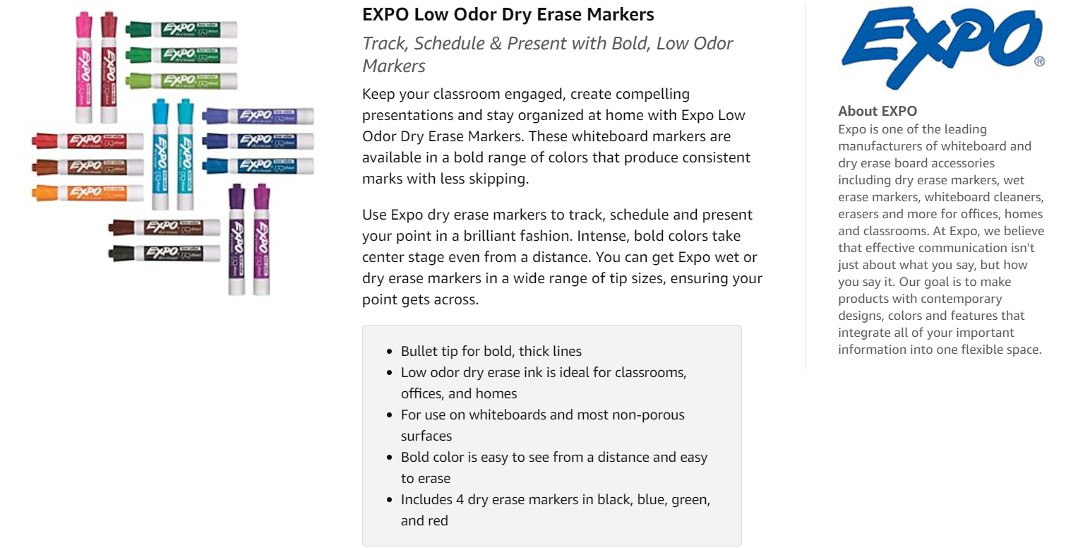Trusted in OfficesFrom important client meetings to brainstorming and strategic planning sessions, you can count on reliable Expo dry erase markers. The #1 dry erase marker brand, the white board markers create consistent, easy-to-read lines and erase cleanly from most non-porous surfaces. |