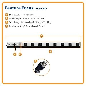 Compatible with all standard electrical equipment, Tripp Lite’s PS240810 power strip features eight NEMA 5-15R outlets in a rugged, all-metal 24-inch housing. The outlets are spaced 2.48-inch apart from center to center, allowing plenty of room for bulky transformers and AC adapters without blocking adjacent outlets.