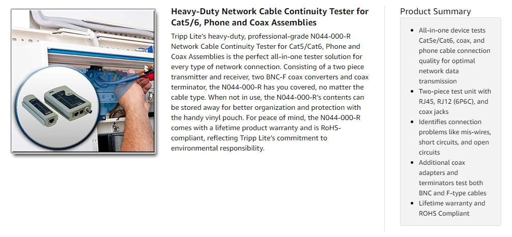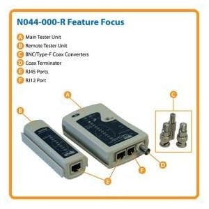 The N044-000-R lets users and technicians test wiring continuity for Cat5, Cat6, phone and coax cable assemblies by identifying mis-wires, short circuits and open circuits. The two piece unit efficiently allows users to test patch cables, home-run wiring (patch panel to wall jack), BNC, or F-type coax cable connections for faulty wiring and circuit malfunction.
