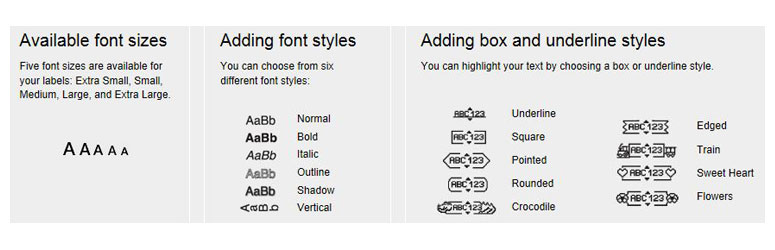 5 font sizes, 7 text styles, 8 box styles, and underline
