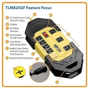The TLM825GF's rugged, all-metal housing is durably constructed, making it an ideal solution for industrial, automotive and mobile worksite applications. It also features a bright yellow color that complies with OSHA color guidelines to alert users to hazardous situations, which may cause minor or moderate injury. Additionally, a built-in cord wrap with hang holes enables convenient cord management.