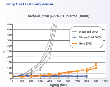 Verbatim’s Gold Archival Grade media has been scientifically tested to outlast standard optical media. When tested under a range of accelerating aging and environmental conditions, including extreme heat, humidity, and ultraviolet light, it produced fewer errors than standard optical discs. And when compared to “gold layer only” discs, Verbatim’s Dual Reflective Layer media delivered significantly longer lifetime performances.