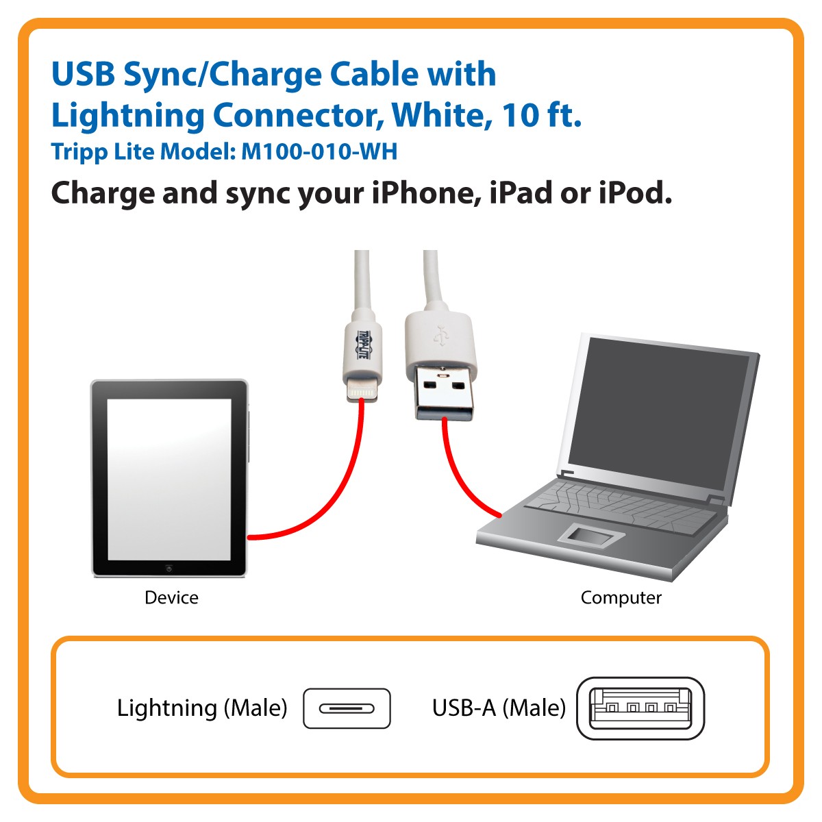 Tripp Lite’s white M100-010-WH USB Sync/Charge Cable connects your latest-generation iPhone, iPad or iPod to the USB-A port on your computer, so you can charge your Apple® device and transfer data at the same time. The cable features a reversible 8-pin Lightning™ plug that connects to your Apple device in either direction, ensuring a fast, fumble-free connection.