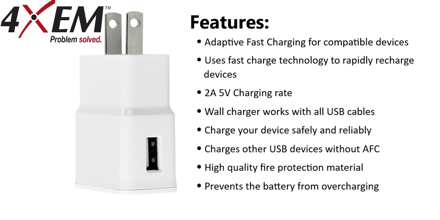 The 4XEM Samsung replacement wall charger is a perfect replacement travel charger for all your Samsung devices. This Adaptive Fast Charging wall charger will charge your device up to 75% faster than a standard charger. Go from 0-50% charge in only 30 minutes.
