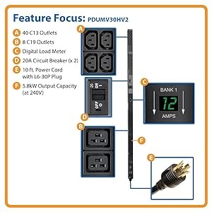 The PDUMV30HV2’s outlets are arranged in two separate load banks, each with 24 outlets (20 C13 and 4 C19 per load bank), a dedicated 20A circuit breaker and a digital meter that reports the bank’s real-time output current in amps. The ammeters let you visually monitor each bank and maintain balance to prevent overloads that could trip the breakers and lead to costly downtime. Total output capacity: 4.8kW (200V), 5kW (208V), 5.8kW (240V).