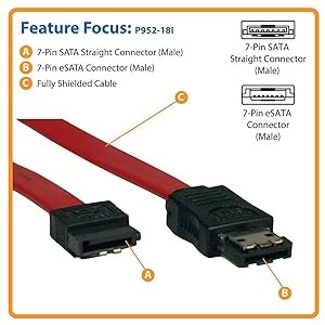 This cable is made to exacting specifications using superior materials for superior connectivity. The P952-18I is fully shielded to protect against EMI/RFI line noise. The 7-pin SATA and eSATA connectors are designed to be durable and withstand frequent use.
