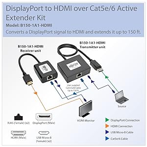 The plug-and-play B150-1A1-HDMI requires no external power, software or drivers, no matter which major operating system you use. Just connect the transmitter’s built-in DisplayPort cable to the source device and a Cat5e/6 cable between the transmitter’s RJ45 output jack and the receiver. Connect the receiver’s built-in HDMI cable to the display. Both units are powered via the included USB Micro-B cables, which connect to USB ports on the source and display devices or USB wall chargers. LEDs light up to indicate when the units are receiving power and sharing a signal. Use the receiver’s equalization control to adjust the video image.
