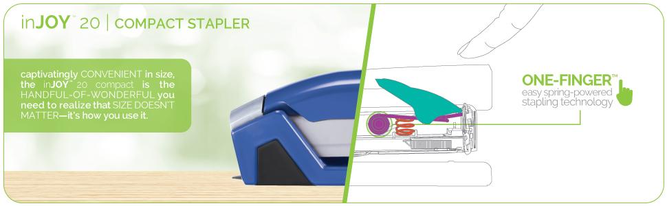 With its One-Finger stapling technology, even the push of a finger can staple up to 20 sheets, jam-free. The smooth, curved handle allows for optimal comfort for those who prefer to hold the stapler in hand. Ideal for the home, office, school, or any bag or backpack, this smaller, more compact stapler is the perfect portable tool for any use.