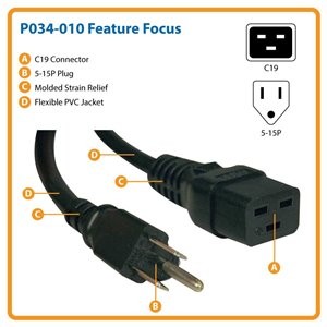Tripp Lite’s P034-010 cable features a C19 connector on one end and a NEMA 5-15P plug on the other end, enabling users to establish power connections for networking equipment with a C19 input. Simply connect the C19 connector into a device and plug the NEMA 5-15P plug into a UPS, PDU or AC wall outlet.