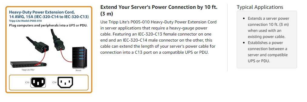 Combining heavy-gauge construction with a high amp rating, the P005-010 is designed for demanding server applications. This SJT cable has three 14 AWG conductors and is rated 15 amps, 100-250V.